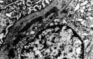 Ⅱ型肾小球毛细血管基底膜不规则增厚。在基底膜致密层内有高电子密度的粗大呈带状的沉积物(图12-16)。故这型肾炎又称为致密沉积物性肾小球肾炎或致密沉积物病。