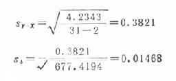 公式(22.8) 公式(22.9) 本例上述已算得 Σ(X-x)2=677.4194 Σ(Y-Y)2=6.7400 Σ(X-x)(Y-Y)=41.2000 分别代入公式(22.9),(22.8),(22.7)和(22.6)得 Σ(Y-Y)2=6.7400-41.20002/677.4194=4.2343
