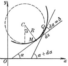 [曲率、曲率半径、曲率圆(或密切圆)与曲率中心的定义]  曲线上两点MQ的切线正向的夹角d与弧长之比,Q趋于M时的极限,