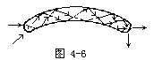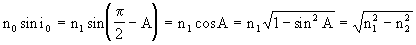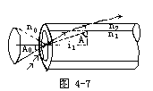 【光导纤维】 光导纤维是利用全反射规律而使光沿着弯曲途径传播的光学元件。它是由非常细的玻璃纤维组成束,每束约有几万根,其中每根通常都是一种带套层的圆柱形透明细丝,直径约为510微米,可用玻璃、石英、塑料等材料在高温下控制而成。它已被广泛地应用于光学窥视(传光、传像)和光通讯。光导纤维的结构如图46所示,内层材料选取的折射率大,外层材料的折射率低,就是要在内外层之间的界面上产生全反射,以保证光的传输效率。如图47所示,单箭头线表示临界光线,它在内外层分界面上的入射角等于或小于临界角A。若在折射率为n0的媒质中入射角大于i0的那些光线(以双箭头表示),在n1n2分界面上的入射角就小于A,这些光线无法通过纤维而在其中传播。只有在媒质n0中其顶角为2i0的锥体内的全部光线才能在光学纤维中传播,根据临界角的定义。