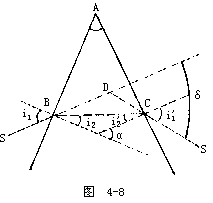 【棱镜的偏向角】 光通过一三棱镜的偏向角等于入射角与出射角之和减去棱镜的折射棱角。如图48所示。a为棱镜的折射棱角,当光束SB入射到棱镜时,经连续发生两次折射,出射光线(CS′和入射光线SB之间的夹角,叫做偏向角“δ”。由图不难看出: