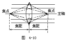 【凸透镜】 凸透镜是中央部分较厚的透镜。凸透镜分为双凸、平凸和凹凸(或正弯月形)等形式,如图49所示。薄凸透镜有会聚作用故又称聚光透镜,较厚的凸透镜则有望远、发散或会聚等作用,这与透镜的厚度有关。将平行光线(如阳光)平行于轴(凸透镜两个球面的球心的连线称为此透镜的主光轴)射入凸透镜,光在透镜的两面经过两次折射后,集中在轴上的一点,此点叫做凸透镜的焦点(记号为F),凸透镜在镜的两侧各有一焦点,如为薄透镜时,此两焦点至透镜中心的距离大致相等。凸透镜之焦距如图410所示,是指焦点到透镜中心的距离,通常以f表示。凸透镜球面半径越小,焦距越短,凸透镜可用于放大镜、老花眼及远视的人戴的眼镜、显微镜、望远镜的透镜等。