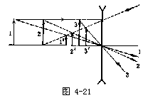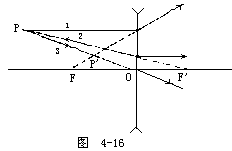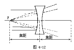 【凹透镜】 两侧面均为球面或一侧是球面另一侧是平面的透明体,中间部分较薄,称为四透镜。分为双凹、平凹及凸凹透镜三种,如图411a所示之ABC。其两面曲率中心之连线图411b所示之G1H,称为主轴,其中央之点O称为光心。通过光心的光线,无论来自何方均不折射。图411c表示,平行主轴之光束,照于凹透镜上折射后向四方发散,逆其发散方向的延长线,则均会于与光源同侧之一点F,其折射光线恰如从F点发出,此点称为虚焦点。在透镜两侧各有一个。凹透镜又称为发散透镜。四透镜的焦距,如图4-12所示。是指由焦点到透镜中心的距离。透镜的球面曲率半径越大其焦距越长,如为薄透镜,则其两侧之焦距相等。