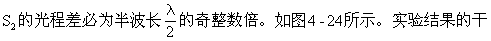 涉条纹如图4-24所示,它是以P0点为对称点而明暗相间的条纹。P0点处的中央条纹是明条纹。当用不同的单色光源作实验时,各明暗条纹的间距并不相同。波长较短的单色光如紫光,条纹较密;波长较长的单色光如红光,条纹较稀。另外,如果用白光作实验,在屏幕上只有中央条纹是白色的。在中央白色条纹的两侧,由于各单色光的明暗条纹的位置不同,形成由紫而红的彩色条纹。干涉明暗条纹的条件由图4-25所示,设相干光源S1S2之间的距离为2a,到屏幕E的距离为D,已知D>>2a。在屏幕上任取一点PPS1S2的距离分别为r1r2。从S1S2所发出的光,到P点处的光程差是: