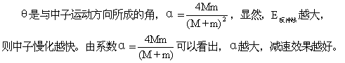 当M=m时(即反冲核的质量等于中子质量时)α最大为1,反之M与m的差距越大其α值越小。比较轻的物质的原子核的质量更接近中子的质量,因而α值大,减速效果好。