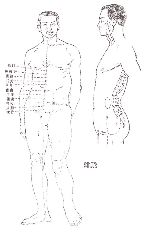 1.循行部位:起于胞宫,下出于会阴,并在此分为二支。上行支:其前行者(冲脉循行的主干部分)沿腹前壁挟脐(脐旁五分)上行,与足少阴经相并,散布于胸中,再向上行,经咽喉,环绕口唇;其后行者沿腹腔后壁,上行于脊柱内。下行支:出会阴下行,沿股内侧下行到大趾间。