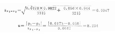 现仍以上述计算率的标准误的例题,进一步检验两个样本率差异有无意义。