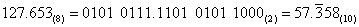 3°  pq转换  通常情况下其步骤是:a(p)a(10)a(q).如果p,q是同一数s的不同次幂,其步骤是:a(p)a(s)a(q).例如,8进数127.653(8)转换为16进数时,由于8=2316=24,所以s=2,其步骤是:首先把8进数的每个数字根据8-2转换表转换为2进数(三位一组)