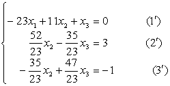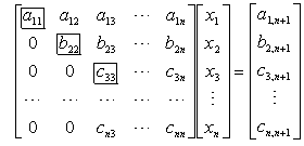 这样做完n次之后,消元过程结束.原来系数矩阵已经化成上三角形矩阵(这时未知数的次序已做了若干次调换).