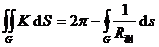 [高涅-波恩涅公式]  G为曲面S上一个单连通区域,G的边界C是一条逐段光滑并无自交点的闭曲线,其运行的方向是使G总是在它的左侧.