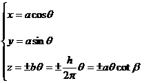 式中为角速度,h称为螺距,称为螺旋角,式中对右螺旋线取正号,对左螺旋线取负号,如果以弧长s为参数,其方程为