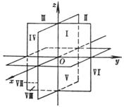 Ox为横轴,Oy为纵轴,Oz为竖轴 M(x, y, z) x为横坐标 y为纵坐标 z为竖坐标 I~VIII为八个卦限,在各个卦限里点的坐标x, y, z的符号为 |