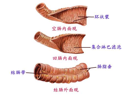 大肠起自回肠,终于肛门。 Since the large intestine and ileum, and finally the anus. 约1.5米,呈“门框”状包绕在小肠周围。 About 1.5 meters, was "door" shape wrapped around the small intestine. 分为盲肠、结肠、直肠三部。 Divided into cecum, colon, rectum three. 盲肠和结肠表面有三个特征性的结构,即:结肠带、结肠袋、肠脂垂。 Cecum and colon surface have three characteristic structures, namely: the colon, colon bags, intestinal fat hanging. 结肠带共三条,交汇于阑尾根部。 Colon with a total of three, the intersection at the root of the appendix.