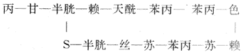 | (三)生长抑素与生长素释放激素1.生长抑素(生长素释放抑制素,growthhormone release-inlease-inhibiting hormone,GHRIH,或somatostatin)是由116个氨基酸的大分子肽裂解而来的十四肽,其分了结构呈环状,在第3位和第14位半胱氨酸之间有一个二硫键,其化学结构为: