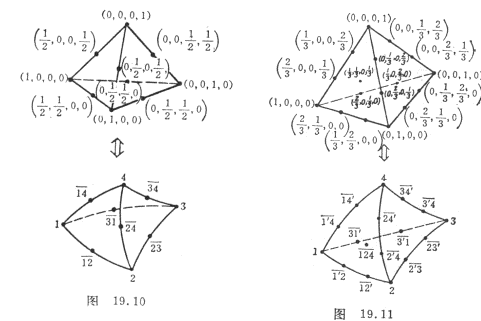 [十节点四面体] 十节点包括四面体的四个顶点和六个棱边的中点(图19.10)。选取体积坐标,其型函数为