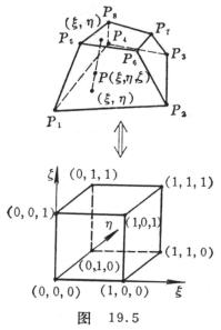 [三向距离坐标]   设六面体的顶点为(i=1,2,,8)(图19.5)。利用双向距离坐标,先把四边形变换到局部坐标系(ξ,η,ζ)的坐标面ζ=0上的单位正方形(0ξ1,0η1);再在线段上定义距离坐标,并取作(1-ζ,ζ), ζ分别为01。现在又对四边形利用双向距离坐标,把它变换到坐标面ζ=1上的单位正方形(0ξ1,0η1)。这就在四边形分别同ζ=0ζ=1上的单位正方形各点间建立一一对应。最后把上下四边形具同样局部坐标(ξ,η)的点联成线段,并沿方向(由下而上)定义距离坐标(1-ζ,ζ)。于是该线段上任意一点P的局部坐标可取为(ξ,η,ζ)。这样,直角坐标系中的任意六面体单元与局部坐标系中的单位立方体(0ξ1,0η1,0ζ1)之间就建立了一一对应。